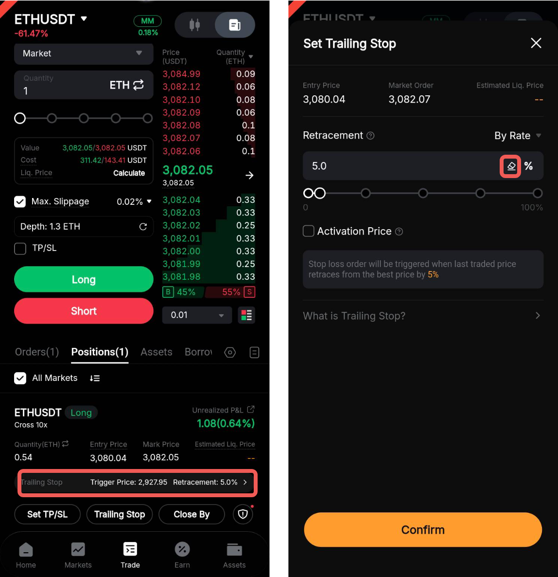 Catatan: Jika Anda memegang posisi Long, pesanan Trailing Stop Anda akan berupa pesanan pasar jual, dan harga aktivasi harus ditetapkan lebih tinggi dari harga masuk rata-rata posisi atau harga perdagangan terakhir saat ini.
