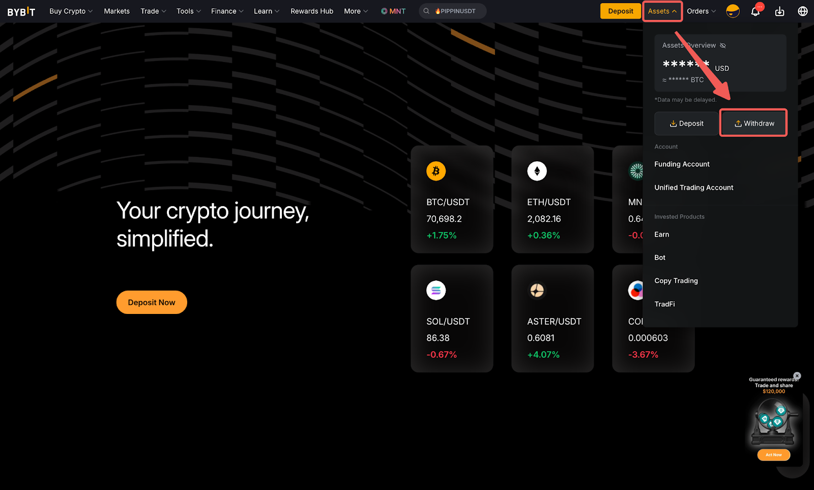 Langkah 1: Arahkan kursor Anda ke Aset di sudut kanan atas laman Beranda Bybit, lalu klik Tarik.