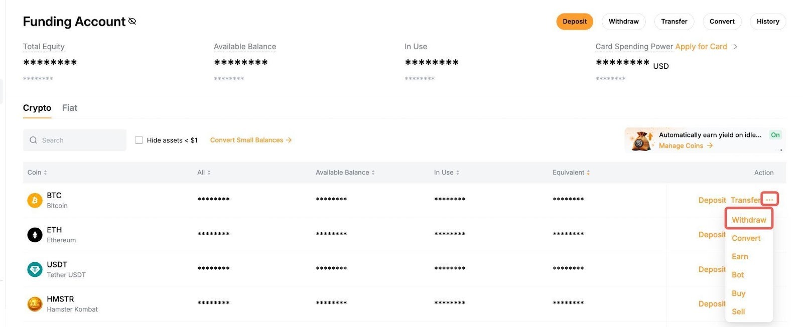 - Tombol Tarik untuk setiap koin hanya dapat diakses melalui Akun Pendanaan Anda.