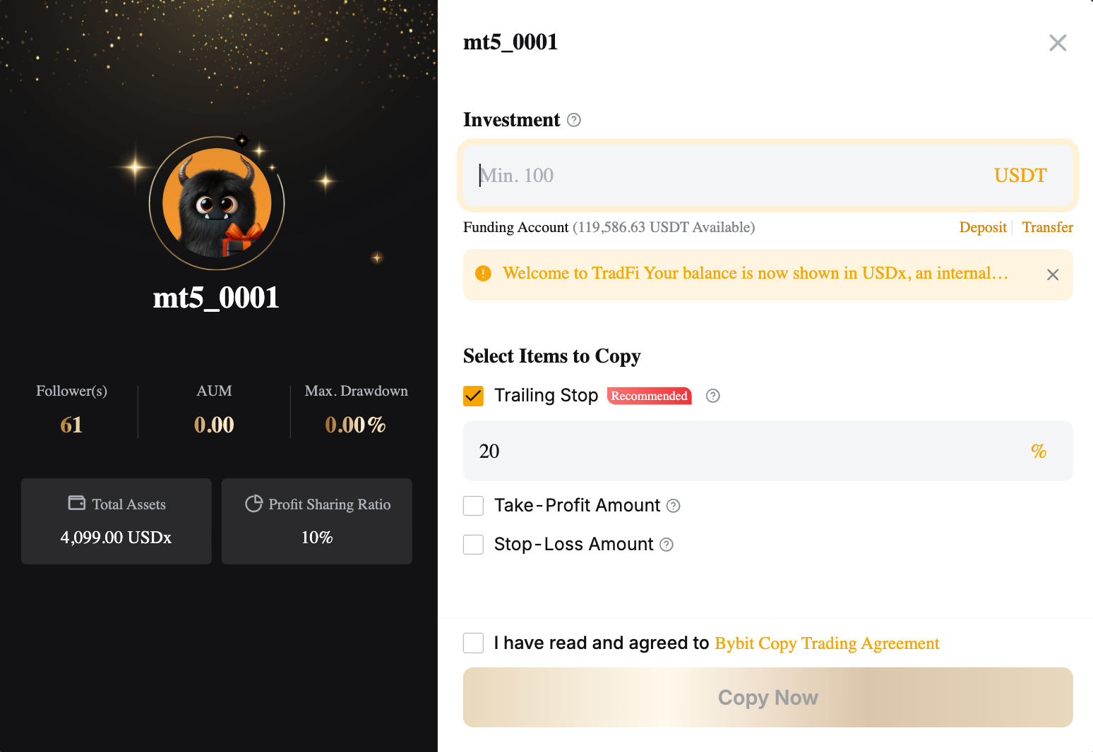 Step 3: Create your Copy Trades by setting your Investment Amount, and set your Trailing Stop and TP/SL Amount.