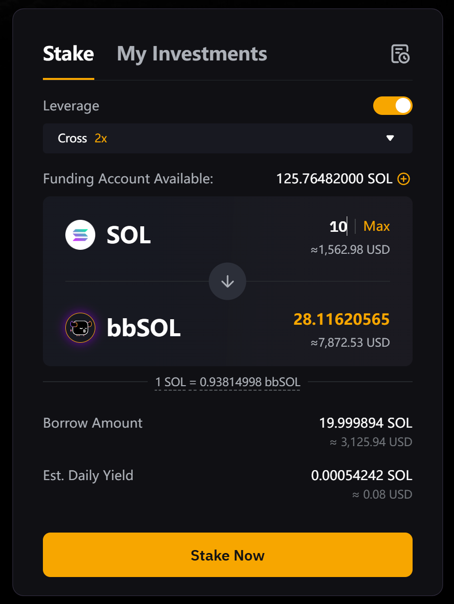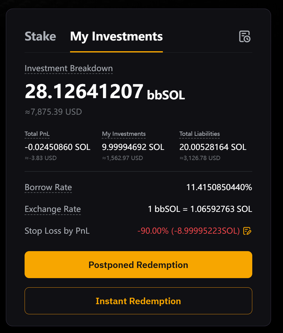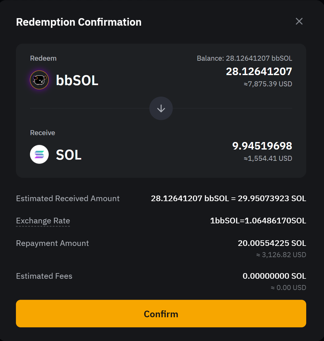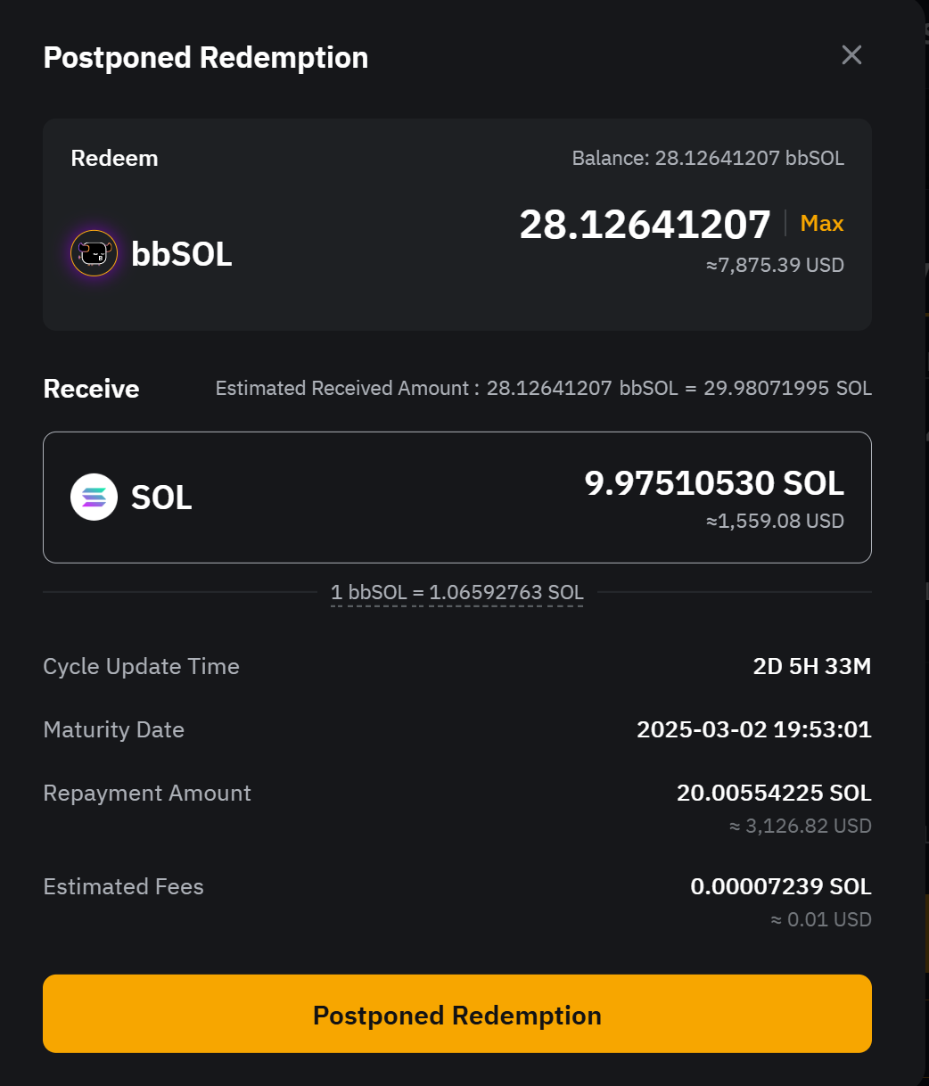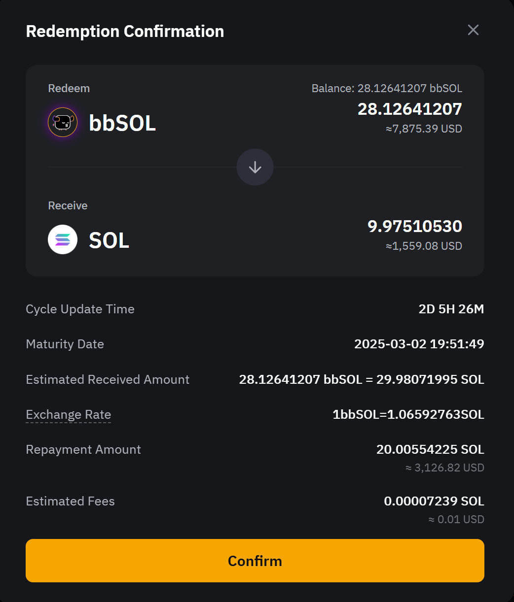 - Resgate regular: Receba seu capital inicial integralmente e todos os ganhos após um período de processamento de 1 a 4 dias, durante o qual os juros continuarão a acumular. Seu bbSOL será convertido para SOL na taxa de conversão em tempo real quando você enviar sua solicitação de resgate.