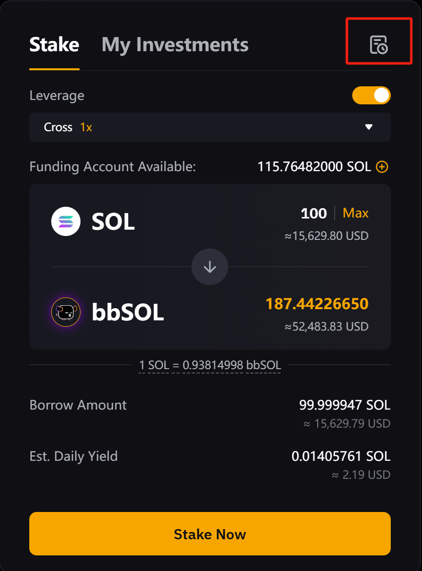 1º passo: Para verificar seus pedidos, clique no ícone do histórico no canto superior direito do painel Faça staking ou Meus Investimentos na página inicial do Staking de SOL como margem.