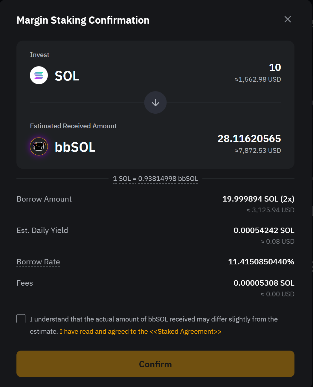— Taxas de staking, resgate e gás se aplicam a ordens de Staking de SOL como margem. Para mais detalhes, leia as Perguntas Frequentes — Staking de SOL como margem.