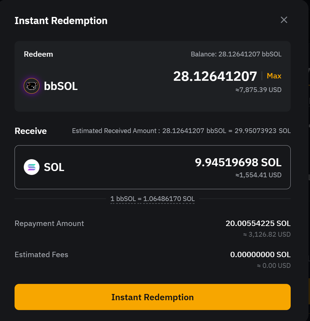3º passo: Um pop-up de confirmação será exibido. Insira a quantidade de bbSOL que deseja resgatar ou clique em Máximo para resgatar todo o seu saldo. O sistema calculará automaticamente o total de SOL que você receberá com base na taxa de conversão em tempo real, bem como a quantidade final após a dedução do pagamento do empréstimo e as taxas vigentes. Revise os detalhes cuidadosamente e clique em Resgate instantâneo ou Resgate regular para prosseguir.
