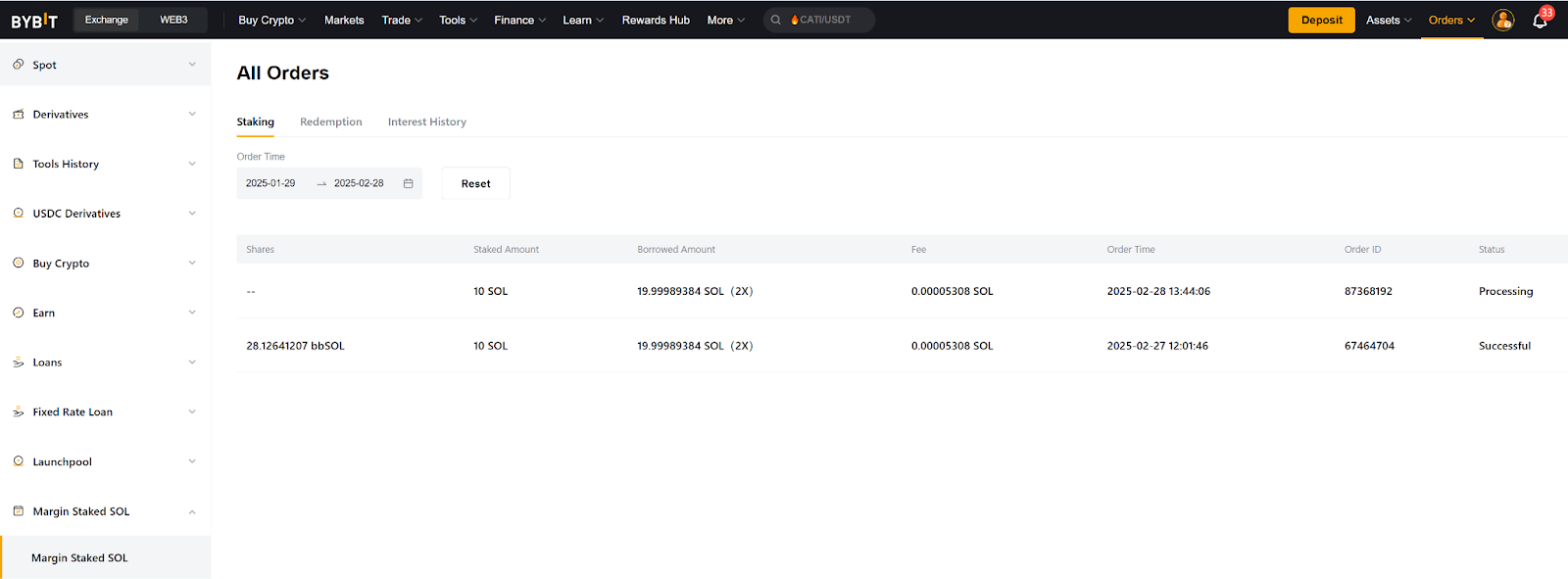 2º passo: Na página de ordens do Staking de SOL como margem, você encontrará mais informações em Staking, Resgate e Histórico de juros.