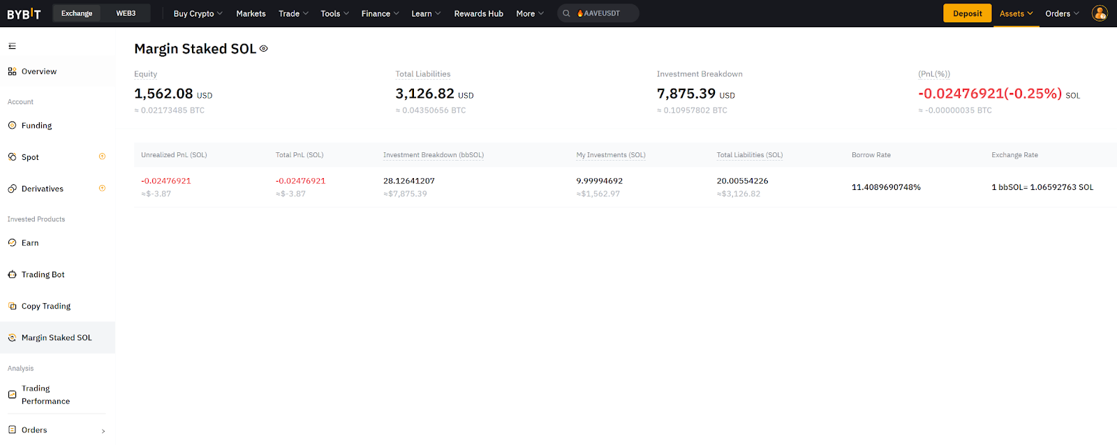 Alternativamente, na página de Ativos do Staking de SOL como margem, você terá uma visão geral do seu P/L, passivos, etc.