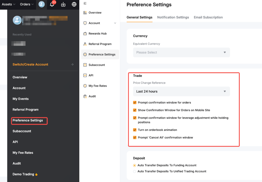 Você também pode decidir o fuso horário e o cálculo das alterações de preço visíveis nas páginas de trading, bem como na animação do livro de ordens. No entanto, observe que a animação do livro de ordens pode ser desativada se você priorizar a velocidade e quiser otimizar sua experiência de trading na Bybit.