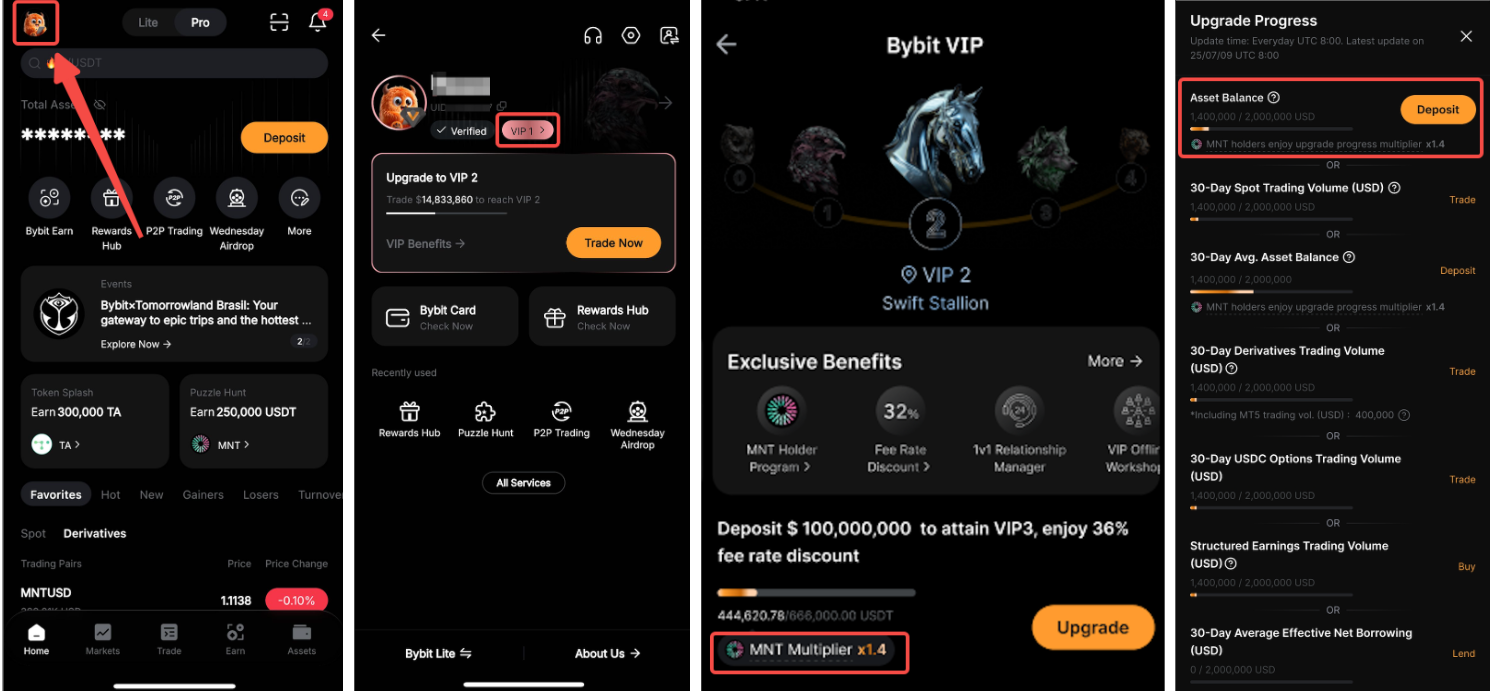 如果您正在使用该应用程序,请点击左上角的个人资料图片,然后点击您的 VIP 级别以查看您的 MNT 乘数状态。
