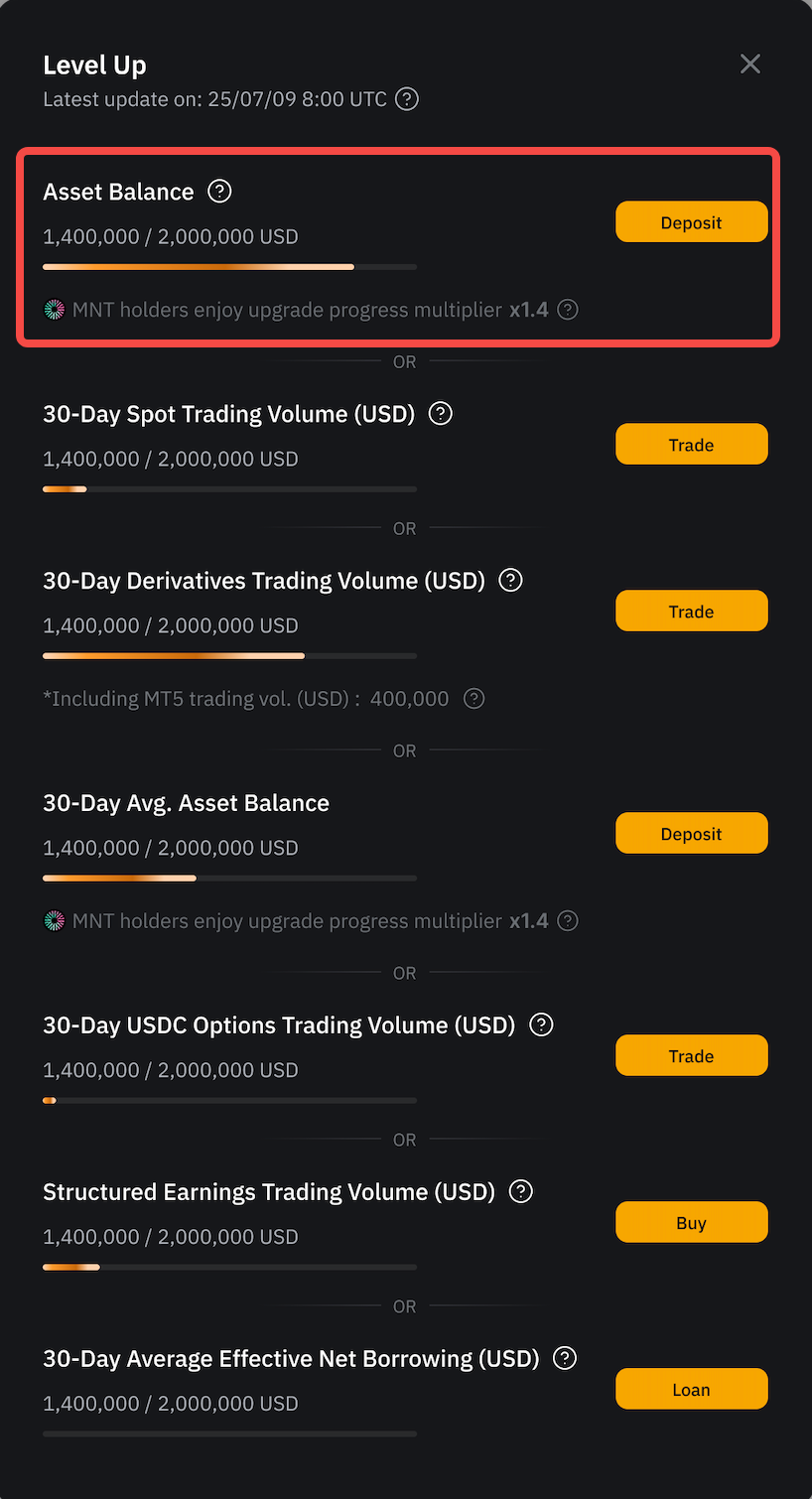MNT 乘数对 MNT 持有者来说是一种好处,通过在资产价值计算中为 MNT 分配额外权重来加速 VIP 升级进展。根据您的 VIP 级别,您的 MNT 持有量将会计入您的总资产价值。有关详细信息,请参阅 MNT 计划简介。