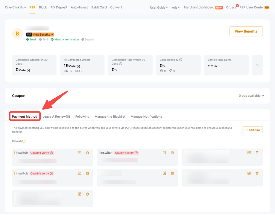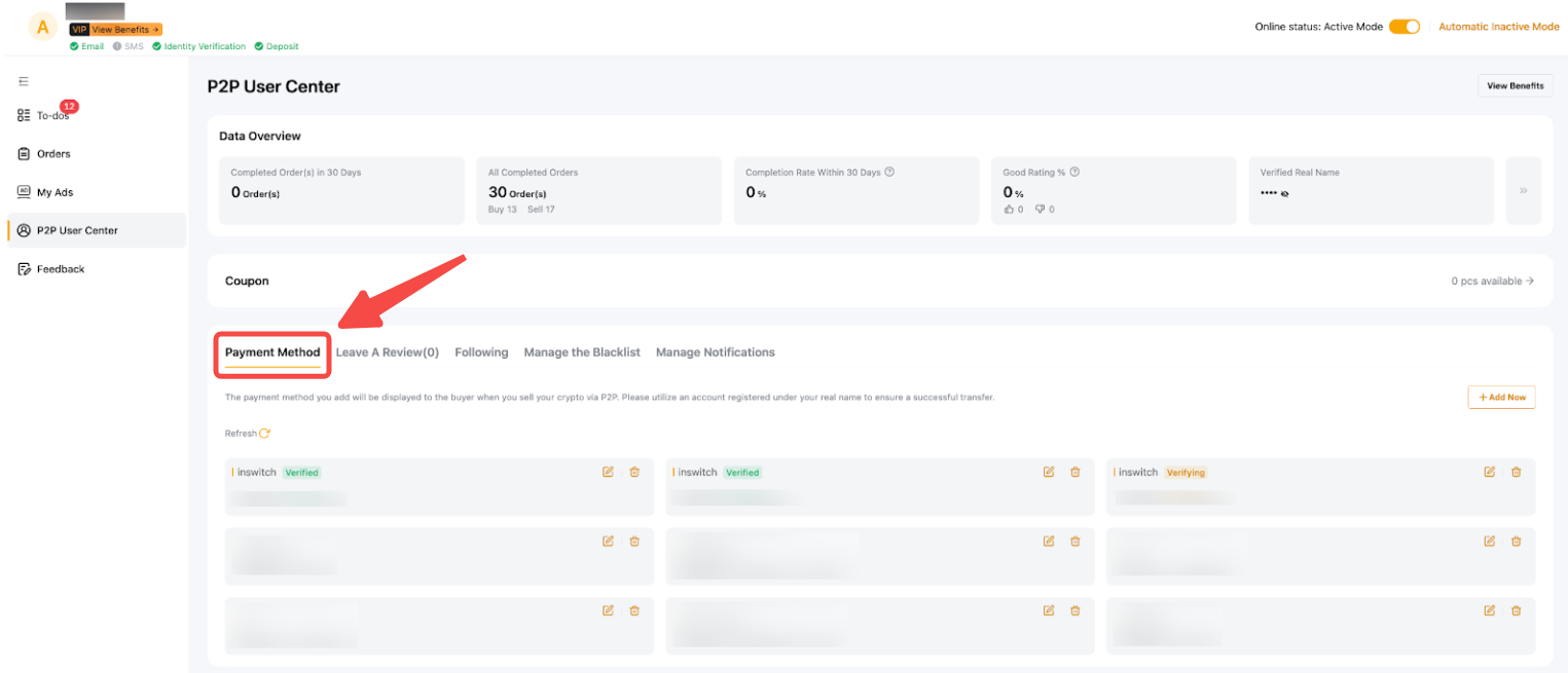 您可以在付款方式页面查看验证状态。要访问此页面,请转到 P2P 用户中心 → 付款方式。