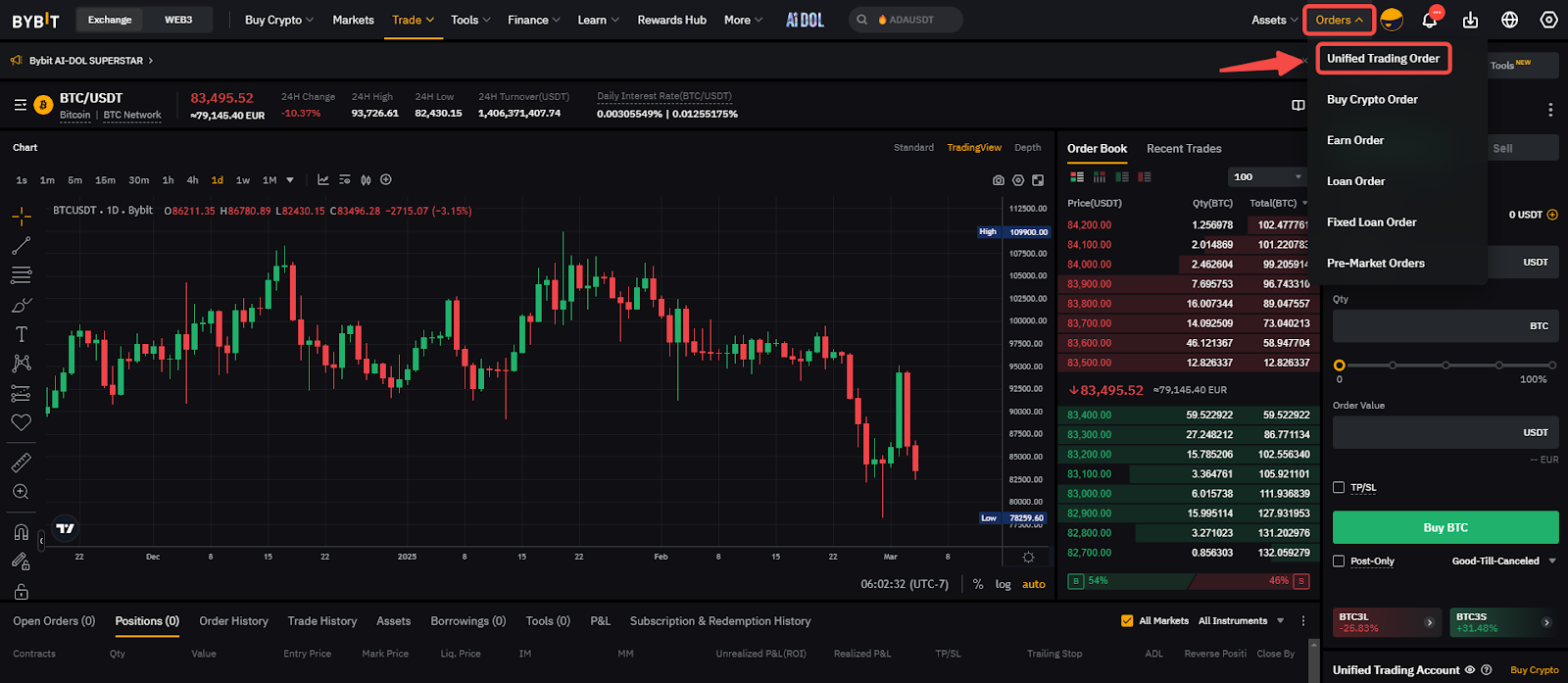 在 Bybit 网站上,请点击订单 → 统一交易订单,查看订单记录。