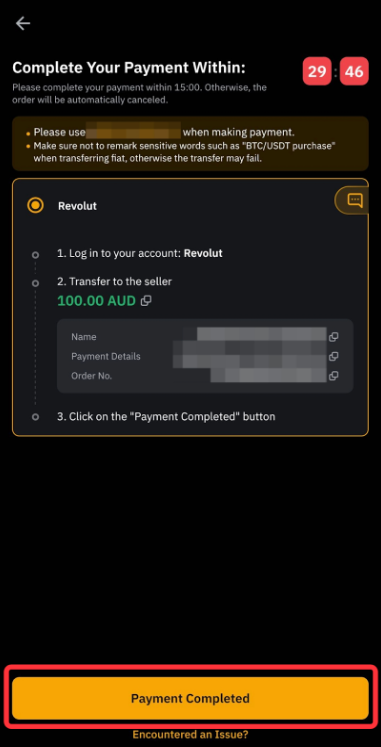 您将被重定向至订单页面,在该页面中,您将看到一个倒计时,用于将资金划转至卖家的银行账户。