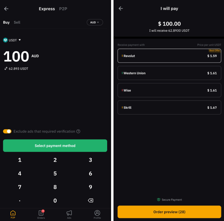 — 如果在 P2P Express 上输入代币或法币金额后没有匹配合适的报价,则表示由于广告商设置了订单限制,目前没有符合您首选价格的广告。您可以选择填写可成交金额以继续使用 P2P Express,也可以前往 P2P 交易页面查看可用广告。