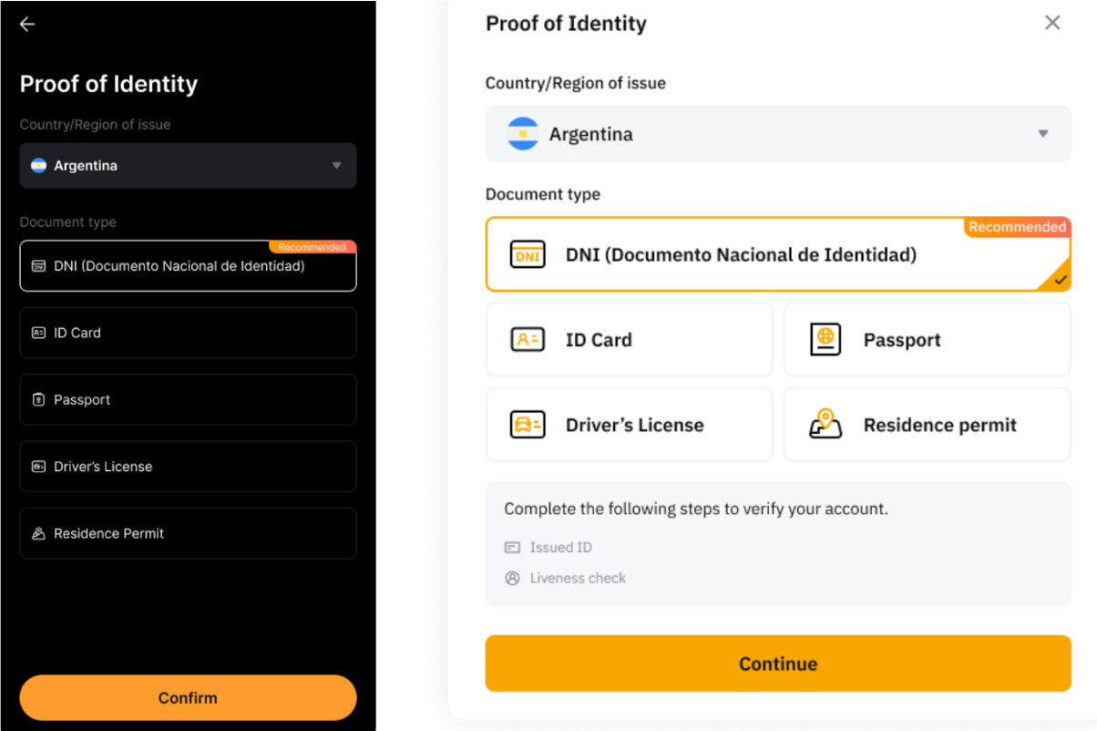阿根廷居民可以使用当地文件类型完成身份验证:DNI(Documento Nacional de Identidad)。