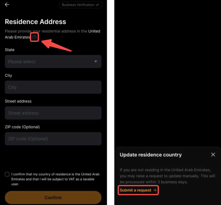 2. 输入您的居住地址,然后勾选复选框以确认您是阿联酋居民,并且作为应税用户需要缴纳增值税。