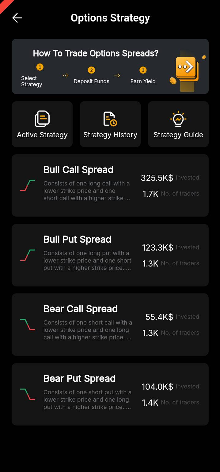 Bybit App 上的期权策略功能提供可自定义的交易预设,方便用户轻松投资牛市和熊市期权市场。借助此功能,您可以通过简单的操作执行各种多头和空头期权交易策略。