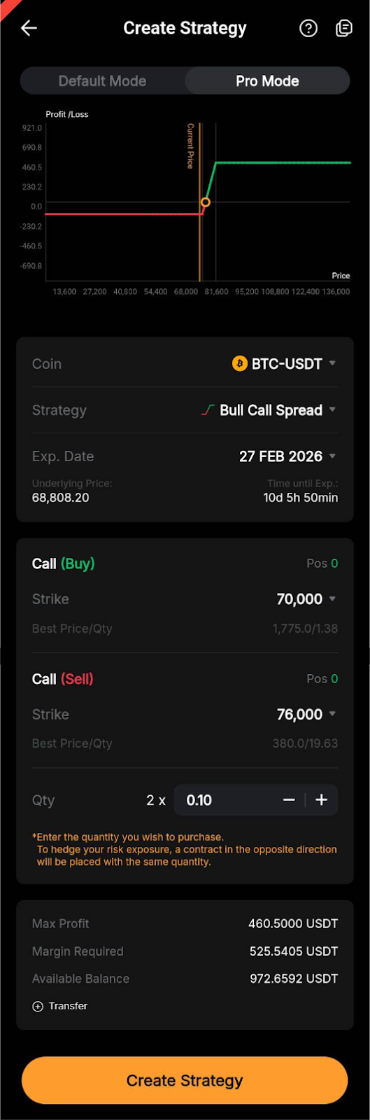 第 2 步: 创建策略页面允许您查看所生成策略的盈亏图、最大利润和所需保证金。