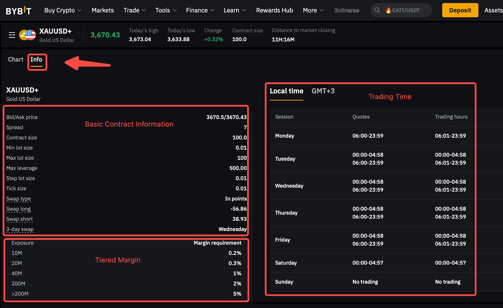 您可以直接在交易页面上查看图表和账户详情,并通过点击【信息】标签查看合同规格。
