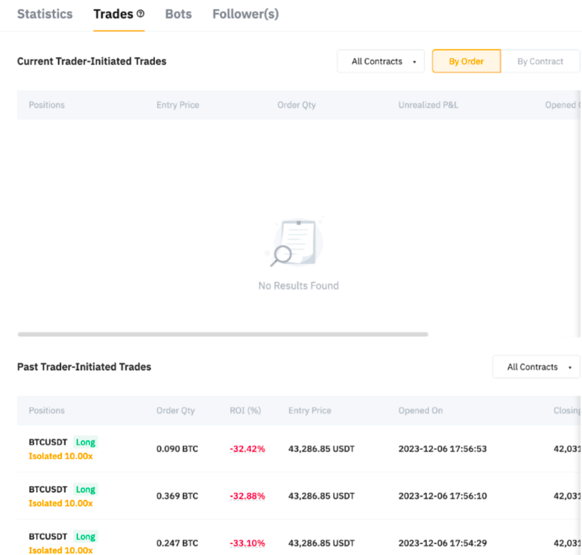 交易记录下的交易品种/占比、总交易次数及交易盈亏将于每日 00:00 (UTC) 更新。此外,交易达人发起的每笔交易都会在此处实时显示。请注意,此处仅显示USDT永续的交易历史。
