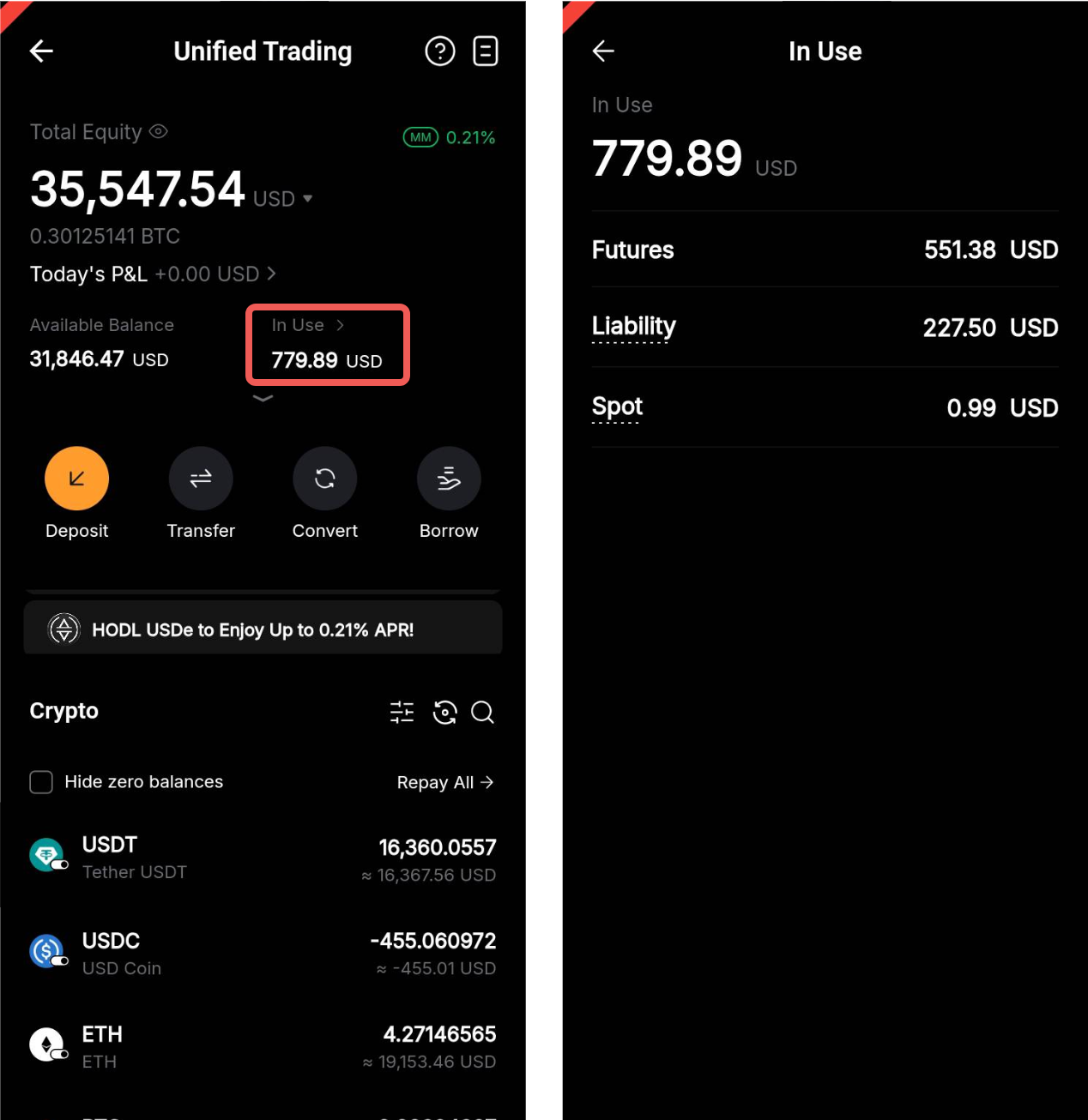 在统一交易账户中, “使用中” 指的是当前在不同产品中被占用的保证金部分。此设计可确保您的资产能够准确反映所有正在进行的交易活动与风险。