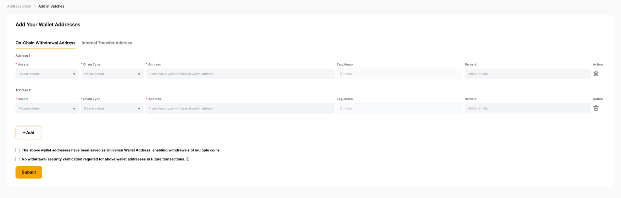 如果您想为链上提款地址和内部转账地址批量添加钱包地址,请注意以下事项: