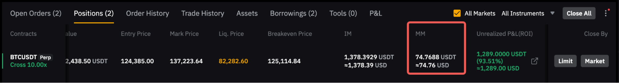 仓位所需的维持保证金 (MM) 可在仓位选项卡中找到。