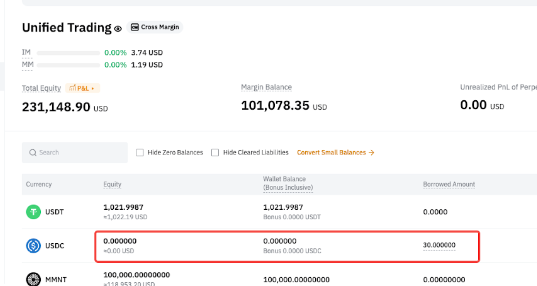 • USDC 钱包余额 = -30