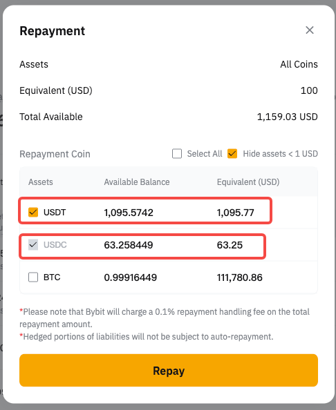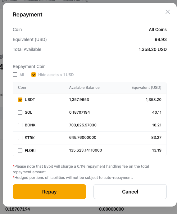 第 2 步: 系统将首先使用您可用的借用硬币进行还款。任何剩余金额将通过将您的抵押品转换为借入的硬币来支付。