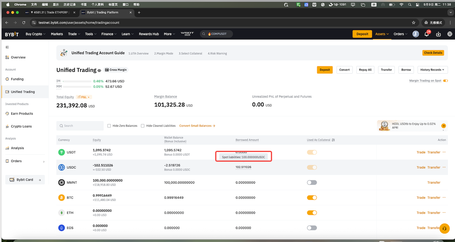 例如,如果您借用了 BTC,但目前没有任何 BTC,通过 BTC/USDT Spot 对使用 USDT 购买 BTC 将自动算作还款。您收到的 BTC 被视为已转移到您的统一交易账户。