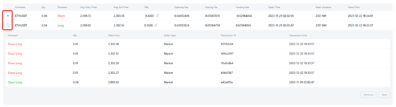 3) 对于平仓仓位,您可以查看已平仓的多头和空头仓位的综合日志。 它包括从初始开仓订单到最终平仓订单的详细信息,并显示根据平均退出价格计算得出的该仓位的完整盈亏。