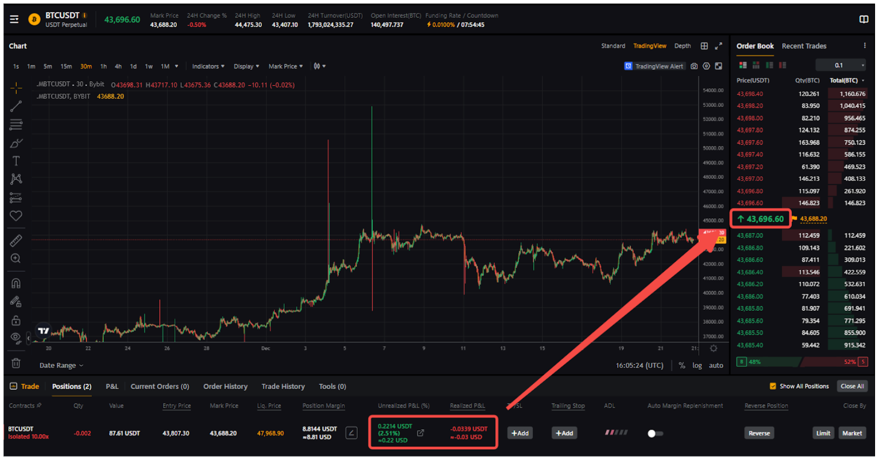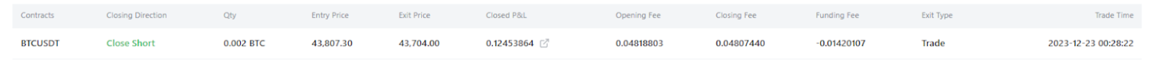 仓位盈亏 = 0.002 x (43,807.30 - 43,704.00) = 0.2066
