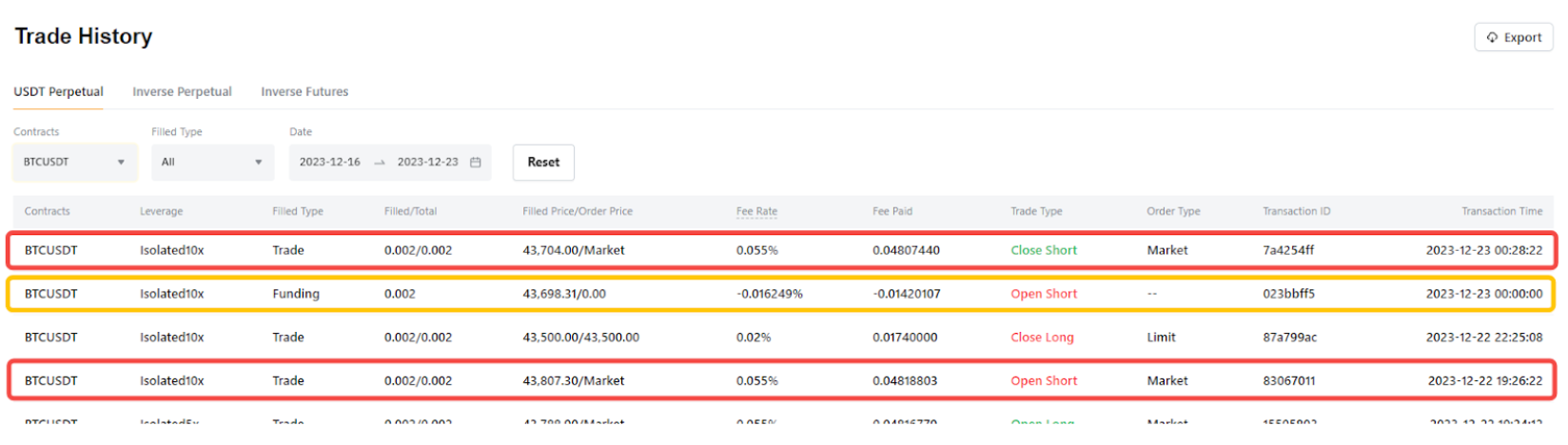 2) 对于平仓订单,显示每笔平仓交易的已结盈亏,包括比例交易费和部分平仓的资金费用。