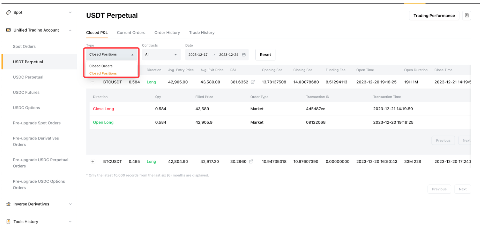 每个仓位的平仓盈亏可通过点击订单 → 衍生品订单或统一交易订单 → 平仓盈亏来查看,并具有以下主要特征。