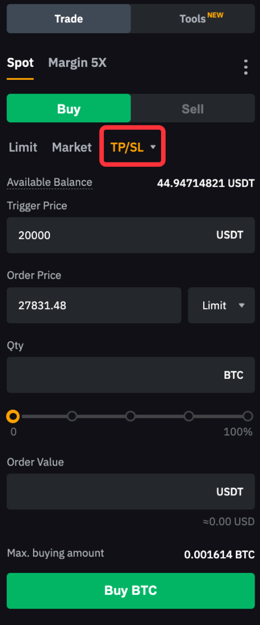 您可以设置止盈/止损订单的触发价格、订单价格(限价单)和订单数量。下达止盈/止损订单时,将会占用资产。一旦最新成交价达到预设的触发价格,就会根据当前的订单参数下达限价单或市价单。