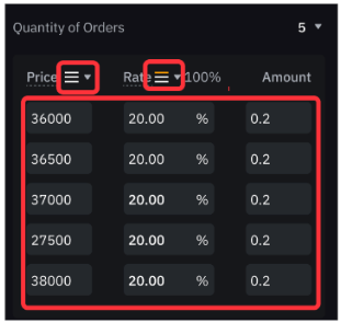 - 您可以选择平均分配订单(等差/均分),或者按照几何增/减量的方式分配(递增或递减)。