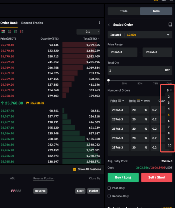 例如,BTCUSDT 的最小和最大订单规模分别为 0.001 BTC 和 100 BTC。因此,分段订单的最小和最大数量则分别为 0.01 BTC 和 1000 BTC。