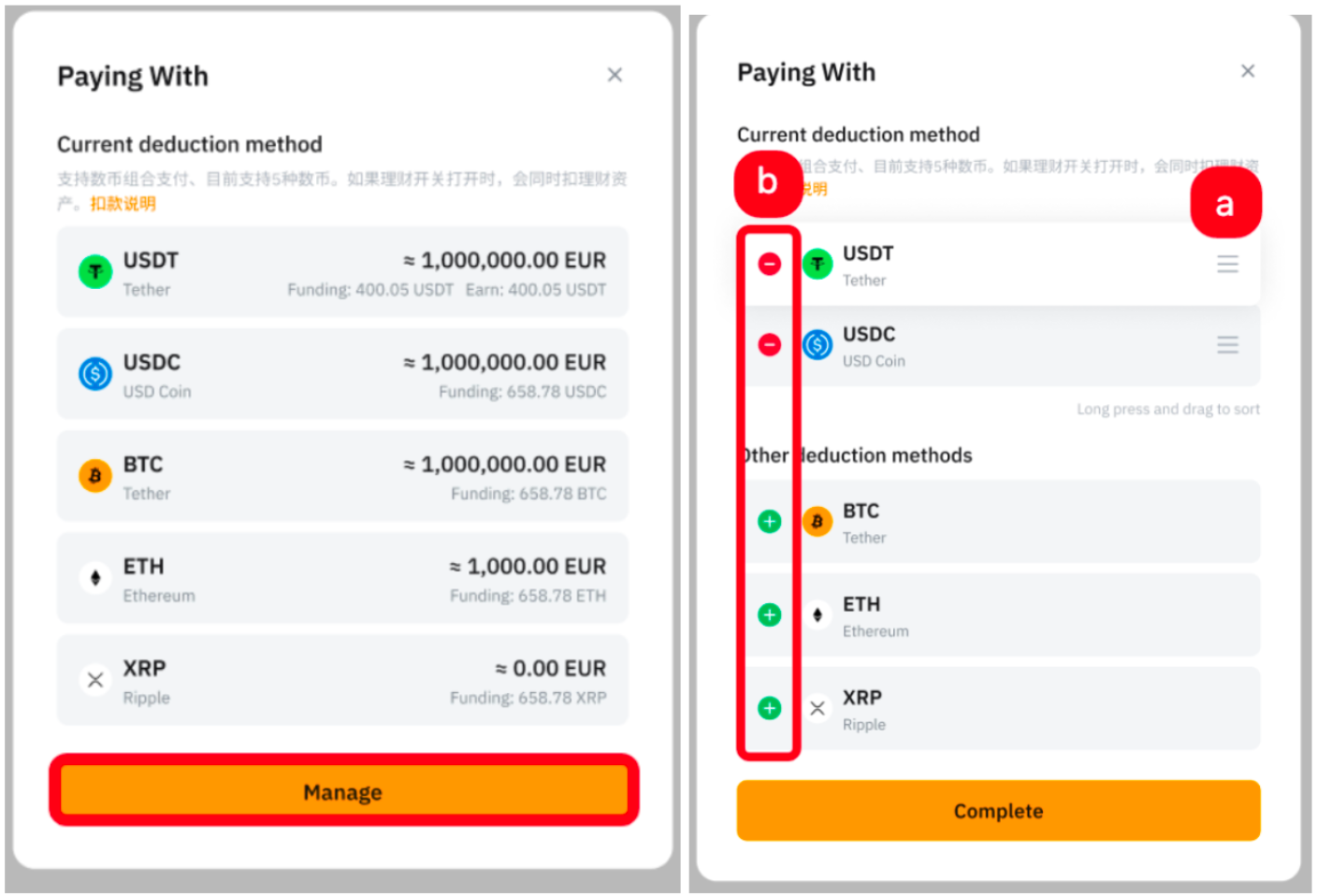 點選付款方式,系統將提示您進入管理視窗。然後,您可以 (a) 透過上下拖曳來管理訂單,或 (b) 從清單中新增和刪除硬幣。完成後,您可以使用 Bybit 卡進行購買,系統將遵循您設定的付款優先順序。