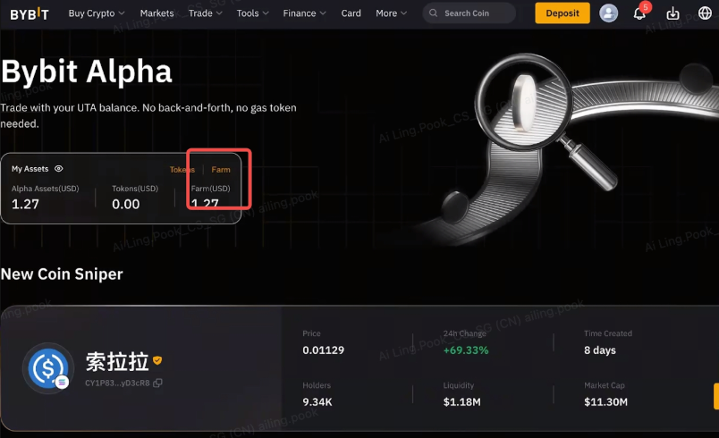If you're using the Bybit App, simply go to Bybit Alpha homepage → Assets → Farm.