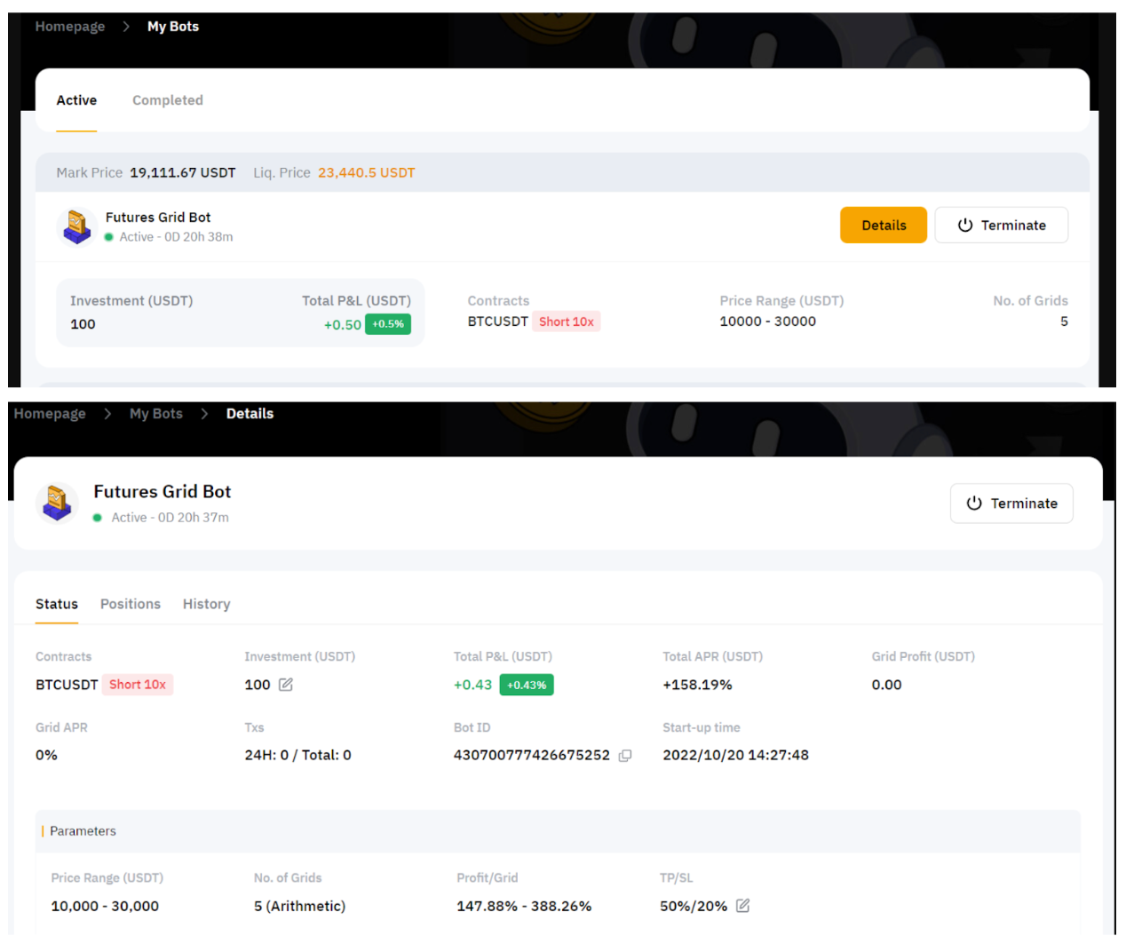 請前往我的機器人查看所有進行中和已完成的交易。您還可以點擊詳情查看您的交易詳情,包括收益、總年化收益率以及價格區間。