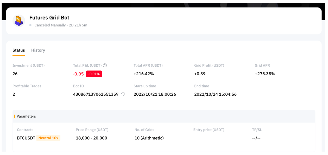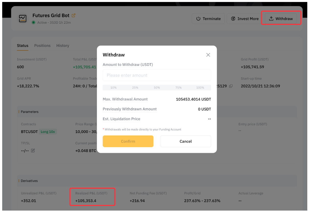 當您的網格機器人運行時,所有利潤都將保留在機器人內。 一旦機器人終止,您的投資金額和利潤將自動轉移到您的資金帳戶。