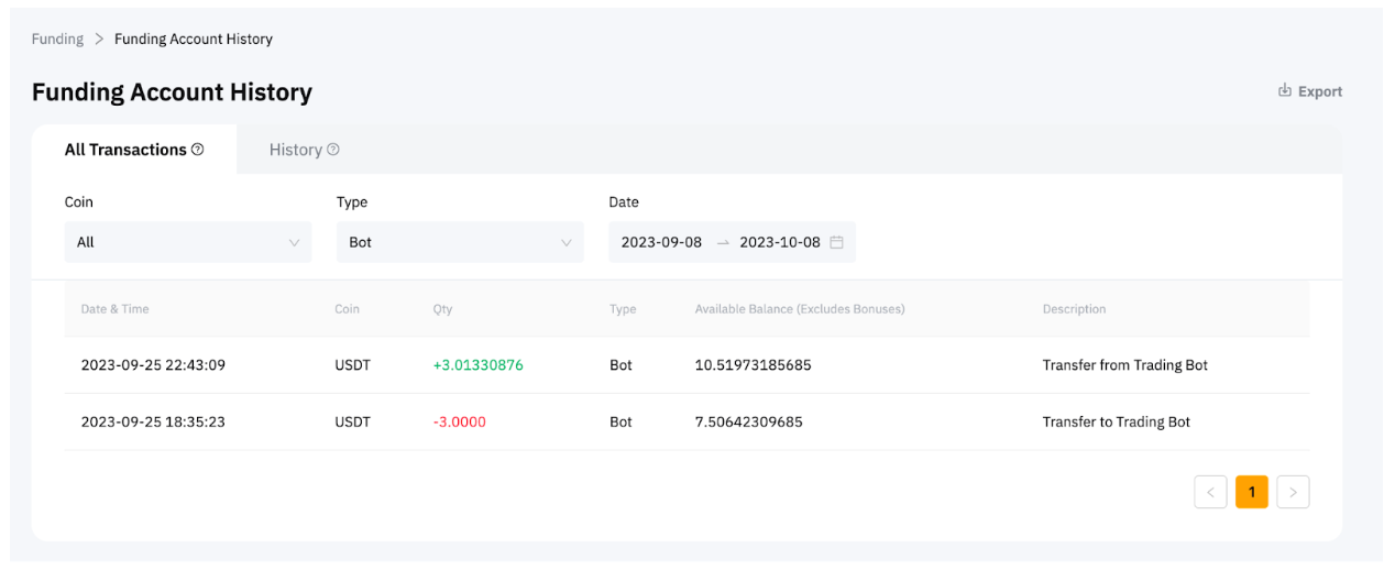 所有交易機器人將直接通過資金賬戶進行交易。當您創立合約網格機器人時,系統會自動將投資金額從您的資金賬戶轉移到網格機器人。機器人停止後,投資金額和利潤(如果有)也將轉回您的資金賬戶。