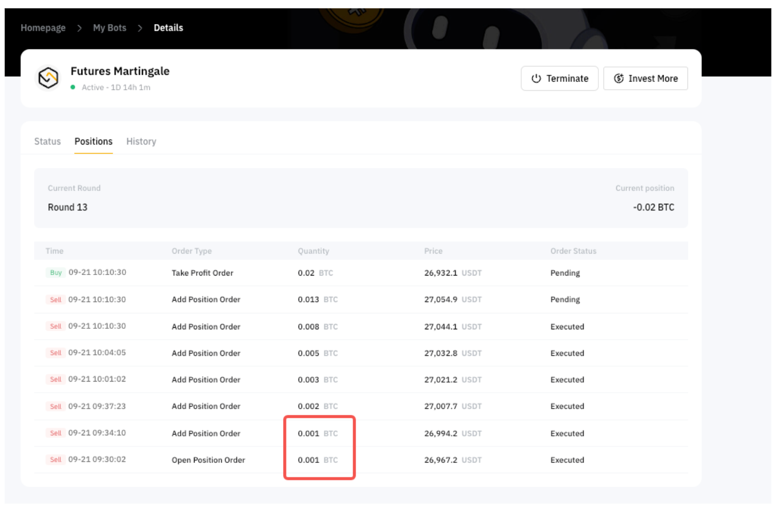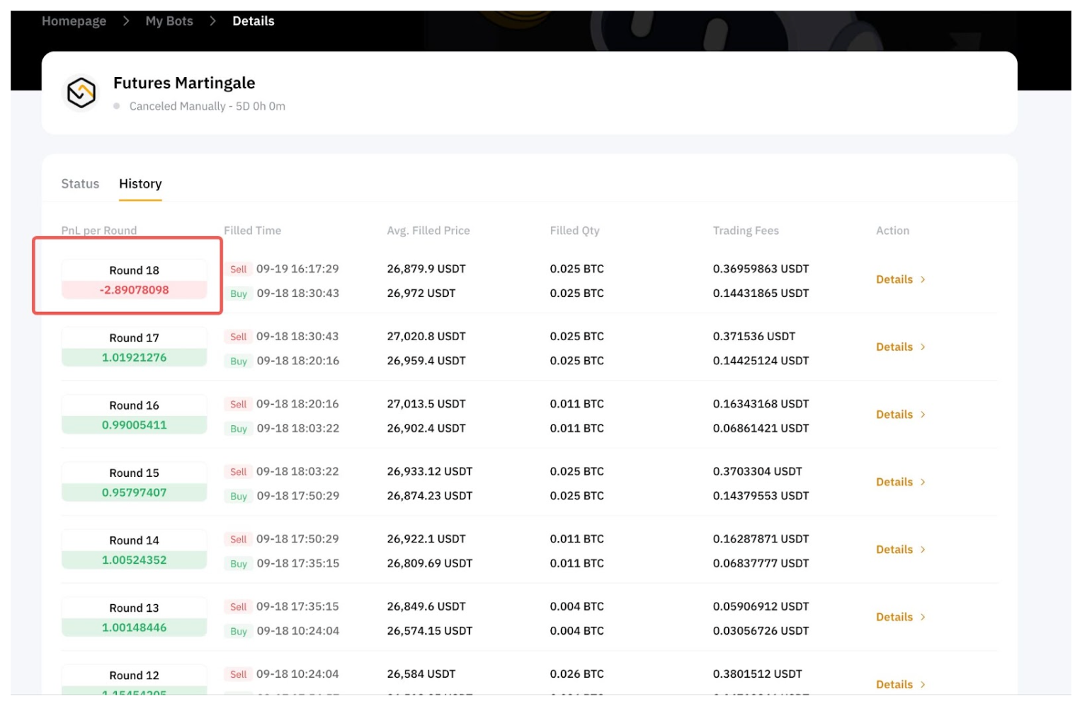 合約馬丁格爾機器人運行時,收益將留在機器人內,但不會用作下一輪次交易的保證金。馬丁格爾機器人策略終止後,資金將從用戶的交易機器人賬戶自動劃轉至資金賬戶。