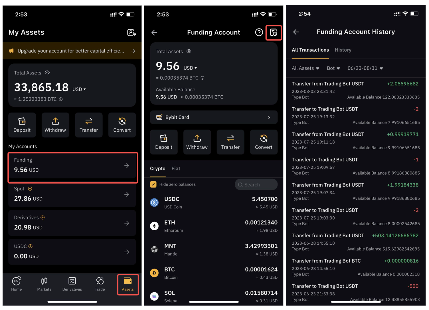 在 Bybit App 端,前往資產資金賬戶,點擊右上角的資金記錄圖標,即可在資金賬戶資金記錄中查看與交易機器人的互轉記錄