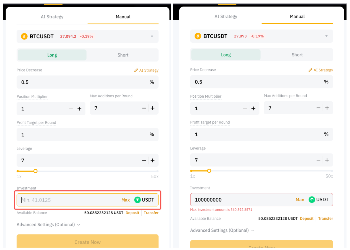 2. 如用合約馬丁格爾機器人交易 USDT 永續合約,必須達到最小訂單規模要求。在計算訂單保證金時,如果算出的保證金低於該最低要求,系統會自動將訂單數量調高至最低要求。這個調高過程可能會導致上一個訂單和當前訂單的比例與預定義加倉倍數不匹配。