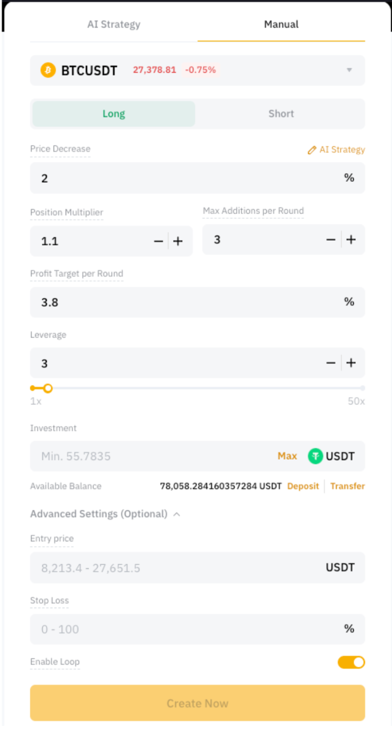 在合約馬丁格爾機器人頁面上,有兩種創建模式可供您選擇:AI 智能策略或手動創建模式。在 AI 智能策略模式下,系統將自動調整參數,以執行 AI 根據歷史數據判斷的最優策略。