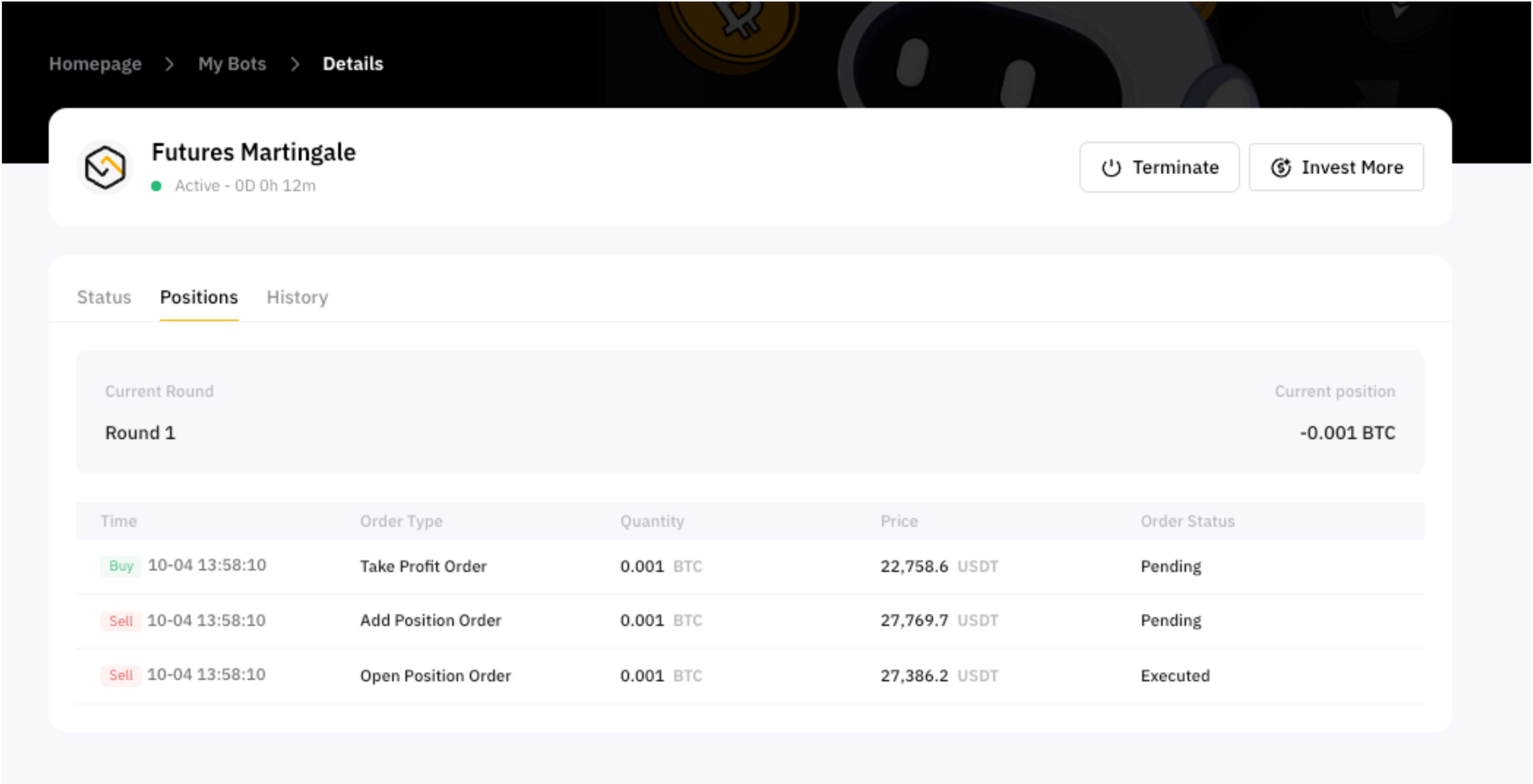 機器人詳情頁面提供了與合約馬丁格爾機器人相關的各種信息,包括您的參數設置。除了這些設置之外,您還應注意以下內容: