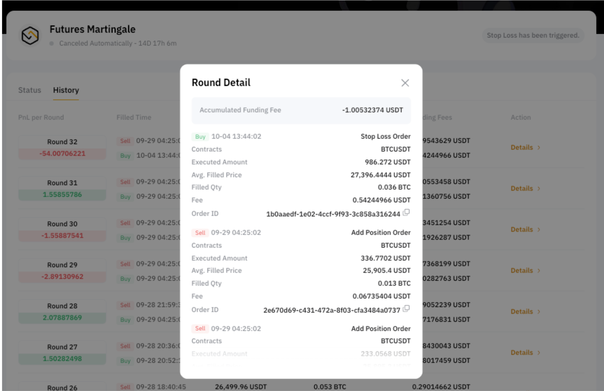 這顯示了此前輪次中的已結盈虧詳情。點擊詳情,即可查看訂單歷史記錄和每一輪的累計費用。