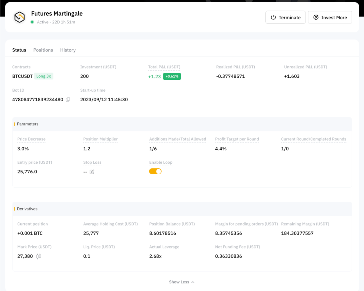 投資額是您希望在機器人中投入的 USDT 金額。系統將根據您設置的參數確定創建機器人所需的最低投資額,但您可以投入超過最低要求的金額。投資額越高,開倉規模越大。 請注意,您需要確保資金賬戶中具有充足的資金 (USDT),才能創建機器人。 |