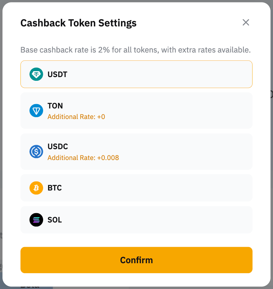 如果您想將返現代幣更改爲其他代幣,請點擊代幣圖標,然後選擇您希望收到的自動返現代幣。