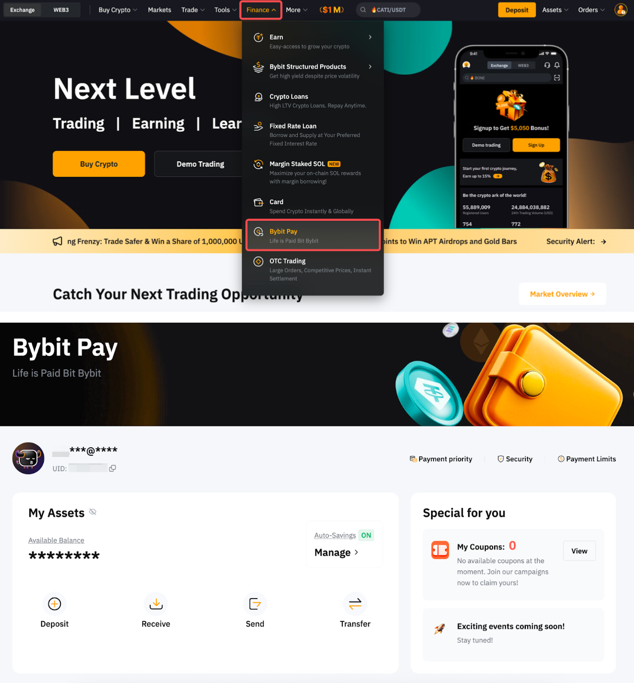 第 1 步:登錄您的賬戶,將鼠標懸停在 Finance →Bybit Pay。